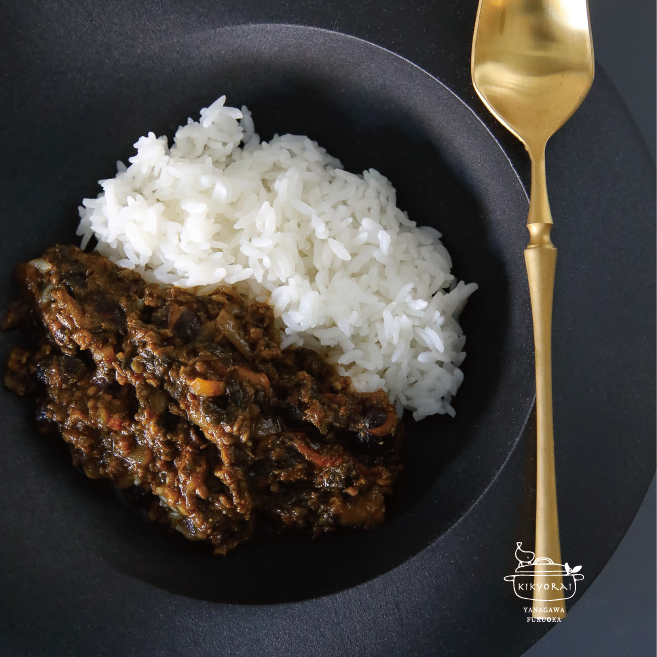 栄養の宝庫、福岡有明のりを贅沢に使った帰去来オリジナルのキーマカレーです。海苔の旨味とコクと絶妙に合うスパイスを配合し、ピリッとした辛みを効かせました。